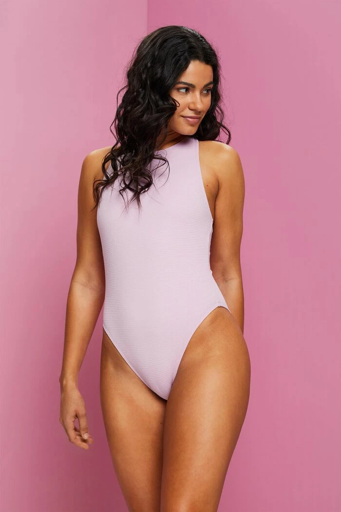 Der stylische Einteiler ist aus einem strukturierten Material gefertigt und präsentiert sich mit gekreuzten Trägern und einer knappen Po-Bedeckung.